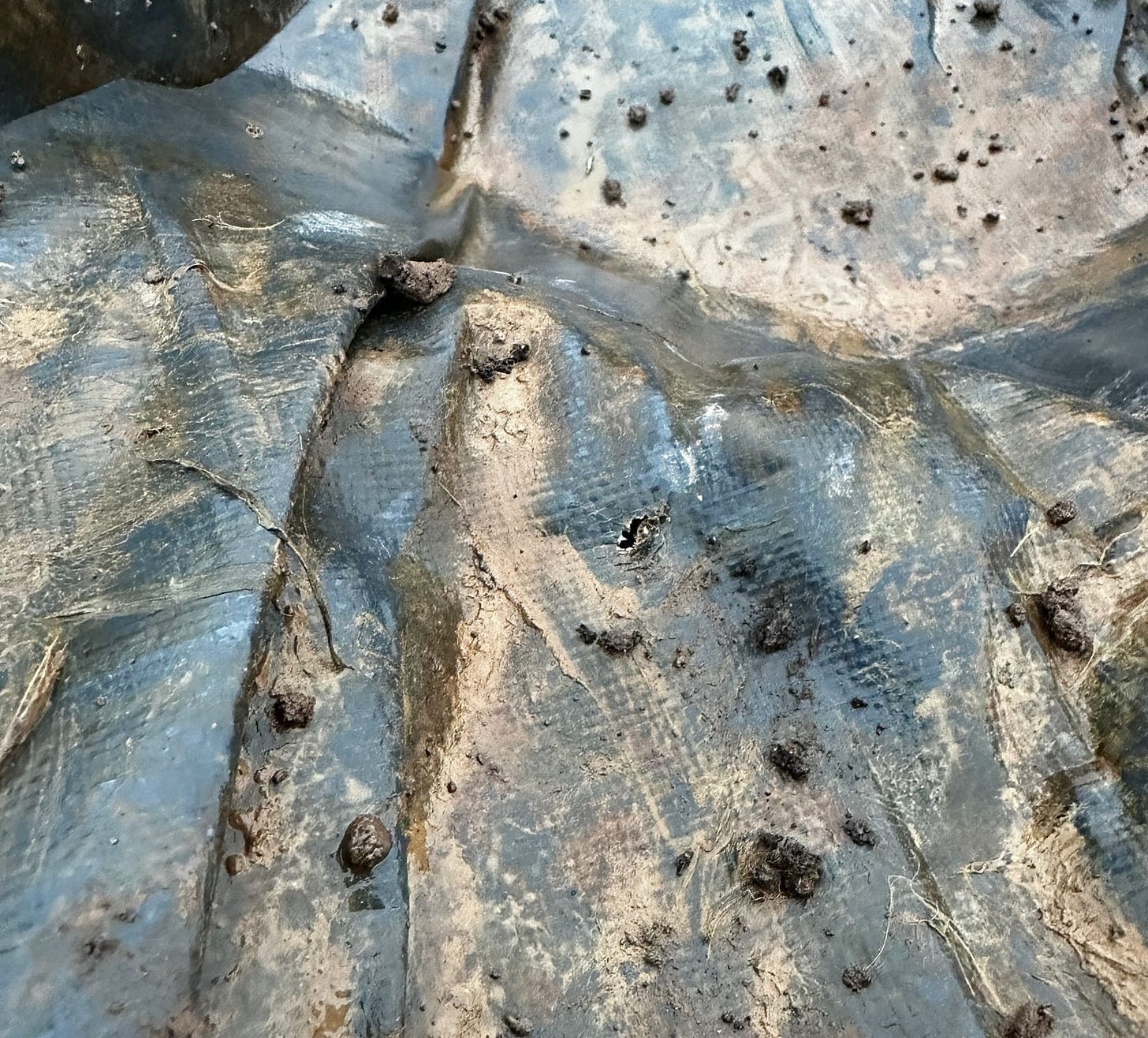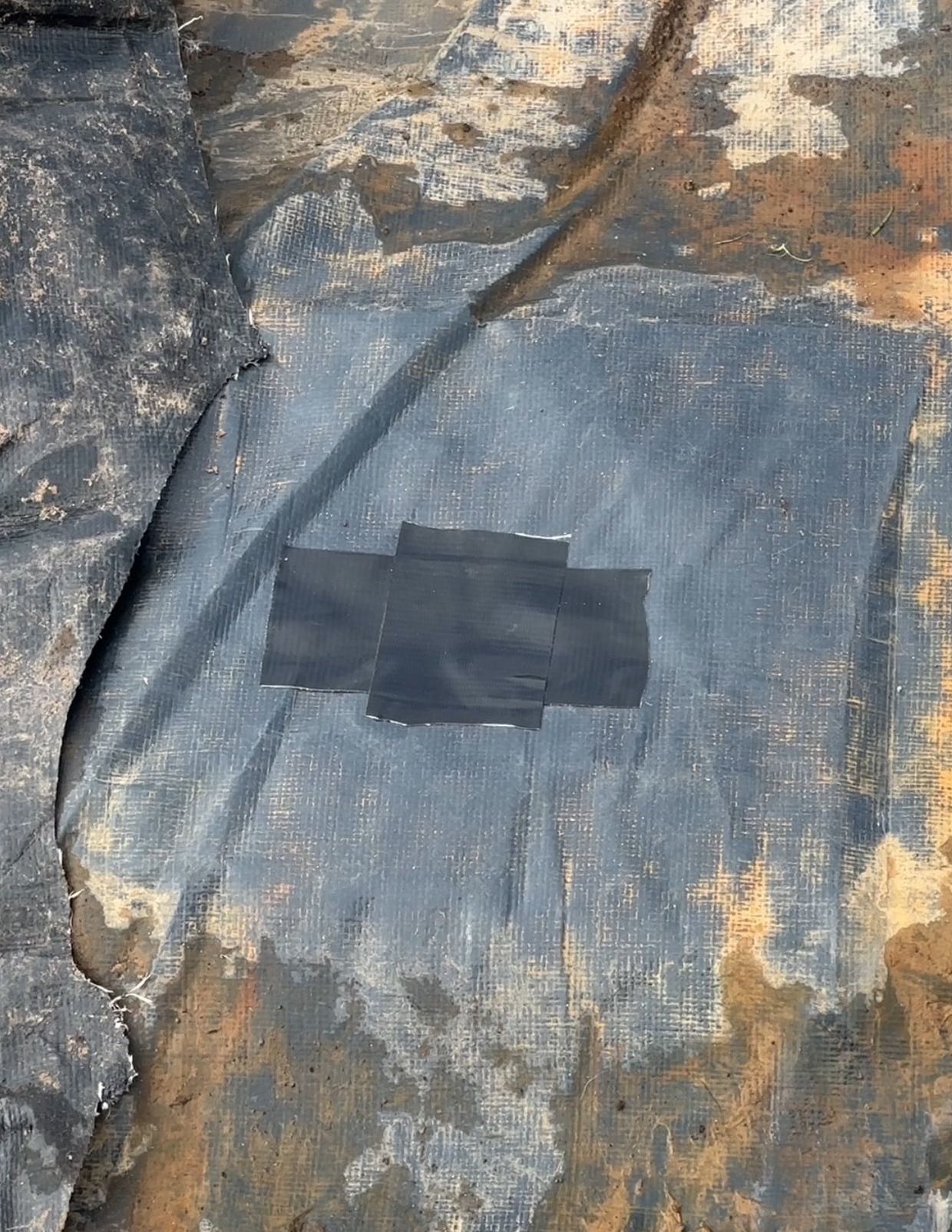 I had a suspicion of where the leak was because, in times of drought, the pond always gravitated to about the same level, which was just below where the leak would presumably be. After spreading the liner out on the gras in the sun, I quickly found the hole right in this area.